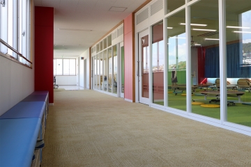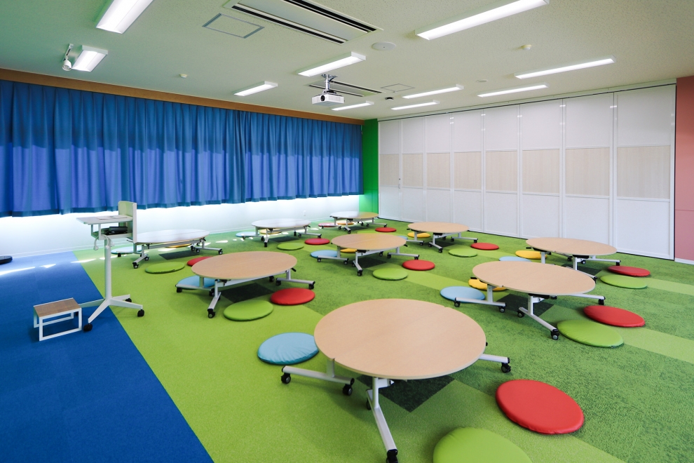 内装は、子どもたちが楽しく学べる環境をつくるため、さまざまな色を組み合わせたカラフルな仕上がりに。こだわりのポイントは、半円型の特注座卓と造作ステージです。