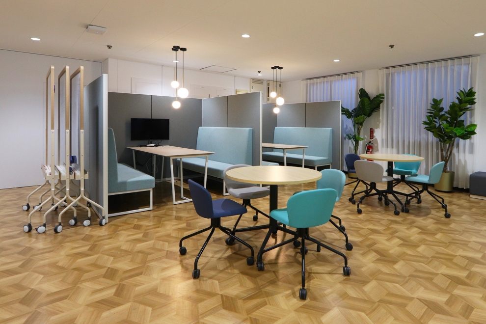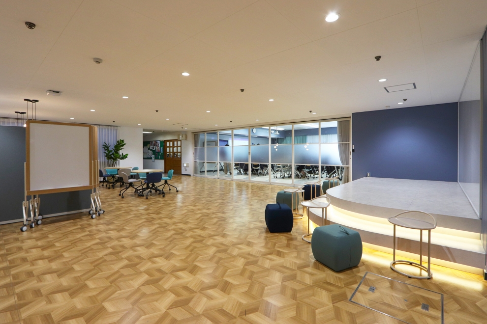 廊下のコミュニケーションスペースにもブルーを用いて、明るく心地よいエリアを形成。造作ステージは使いやすい高さと広さで設計し、周囲には自由に移動できるスツールやテーブルを配置することで、話し合いや発表をさまざまなスタイルで行えるようにしています。造作ステージの照明の切り替えによって、特別感のある空間演出も可能です。