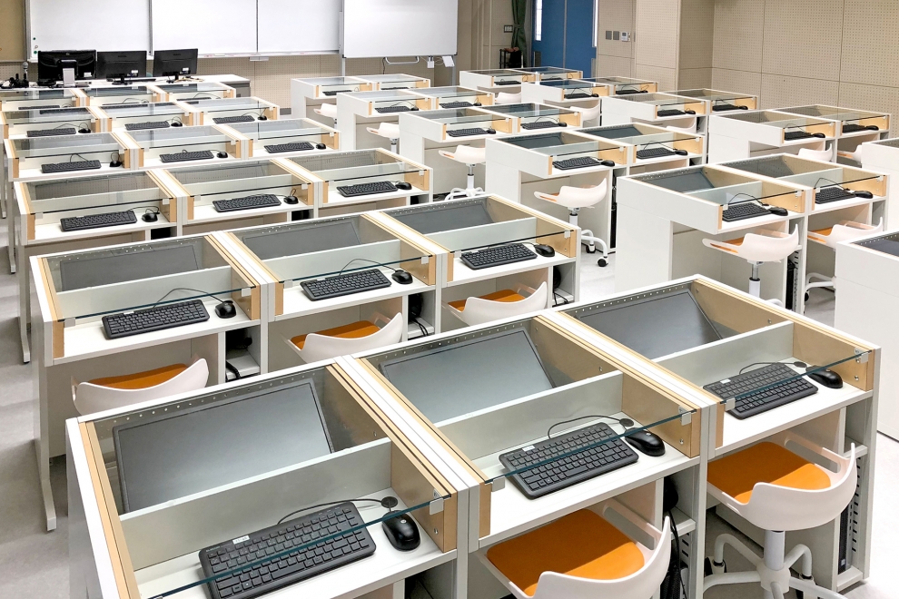 神戸市立工業高等専門学校様のLL教室へディスプレイ埋め込み式ガラス天板デスクを導入頂きました。 リスニング授業の際、大型化するディスプレイで学生の顔が隠れてしまい、先生が学生の表情を確認できない問題を解決すべく、ガラス天板のディスプレイ埋め込み式のデスクをご採用頂きました。 ガラス天板は照明の反射を抑えるため特殊フィルムを施工した神戸高専仕様となっています。限りあるスペースに人数を収容する為にGC-1000(チェア)を組み合わせた点もご満足いただけました。