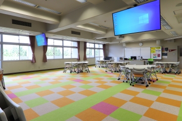当初は上履きのまま使用する予定でしたが、カーペットデザインの良さから上履き厳禁となり、学校様に靴箱を制作していただくなど、学校様とも協力して作り上げた非常に印象深い教室となりました。