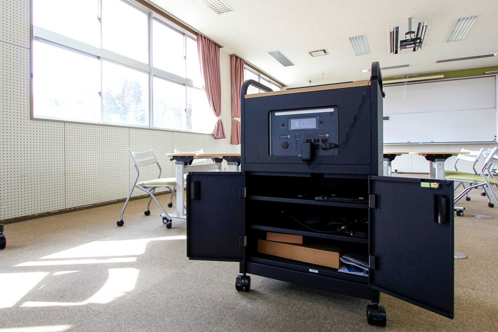 デスクとチェアは簡単に動かせるので、講義型・グループワーク型など様々な授業形態に合わせて運用することができます。特注のモバイルバッテリー収納カートは、移動ができる電源付き教卓として利用できます。寸法も広めにカスタマイズしており、天板の上に先生のパソコンやwebカメラなどを同時に置けて、オンライン授業などで便利にお使い頂けます。カート下部は鍵付き収納庫としてカスタマイズしており、webカメラなどの配信機材を収納できます。