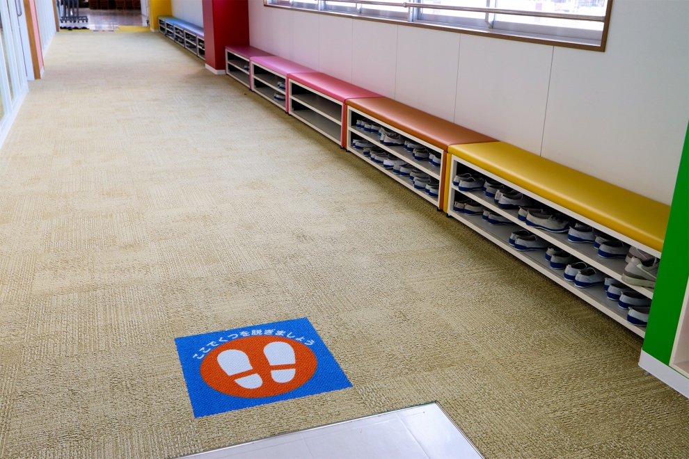 内装は、子どもたちが楽しく学べる環境をつくるため、さまざまな色を組み合わせたカラフルな仕上がりに。こだわりのポイントは、半円型の特注座卓と造作ステージです。