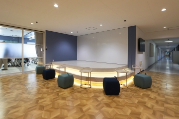 廊下のコミュニケーションスペースにもブルーを用いて、明るく心地よいエリアを形成。造作ステージは使いやすい高さと広さで設計し、周囲には自由に移動できるスツールやテーブルを配置することで、話し合いや発表をさまざまなスタイルで行えるようにしています。造作ステージの照明の切り替えによって、特別感のある空間演出も可能です。